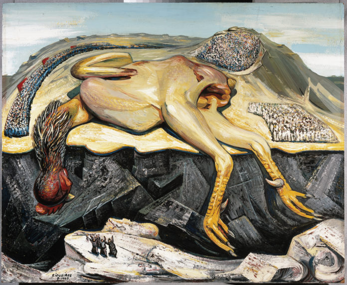 Entre las piezas destaca Muerte y los funerales de Caín, de Siqueiros; retrata un pollo gigante sin vida y desplumado, siendo adorado por cientos de figuras diminutas. “Para mí, él es uno de los grandes maestros de la plástica nacional; su trabajo me resulta estremecedor y fascinante. Este cuadro siempre me ha generado interrogantes”.