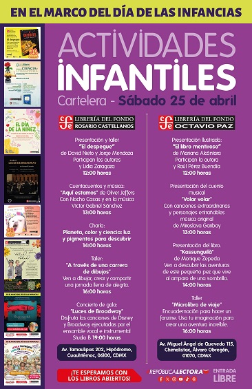 Acompáñanos este sábado 25 de abril; tendremos: cuentacuentos, talleres de dibujo, charlas de ciencia, música y presentaciones de libros en nuestras dos sedes: