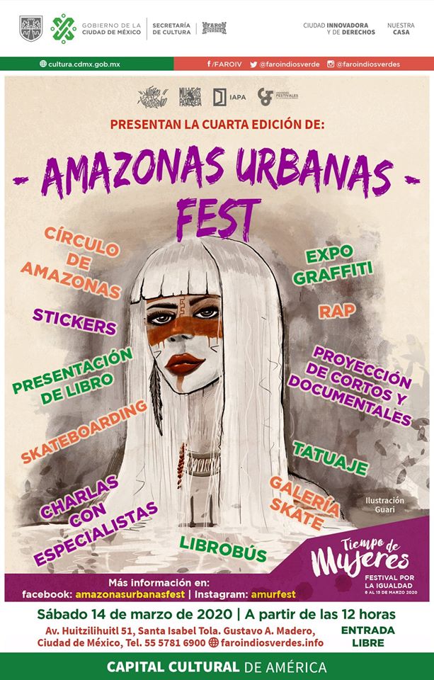 Nos emociona muchísimo el poder compartirles el cartel oficial de la 4ta Edición del Amazonas Urbanas Fest en FARO Indios Verdes. Nos alegra anunciar que nuestro proyecto sigue creciendo y este año contamos con el apoyo de Grandes Festivales de la Ciudad de México y la colaboración del Instituto para la Atención y Prevención de las Adicciones para la realización de nuestras actividades en la que como cada año tendremos nuestra Expo Grafitti en la que artistas invitados estarán interviniendo las bardas perimetrales e interiores del FARO, nuestra Galería Itinerante y nuevas dinámicas de participación como la charla 'Círculo de Amazonas', Proyección de documentales y la Presentación del libro Réquiem por Teresa. Además este año seguimos ampliando nuestra oferta cultural por lo que contaremos con la presencia del Librobús de Educal con títulos del Fondo de Cultura Económica y otras editoriales a precios accesibles para fomentar la lectura en la comunidad, así que tendremos actividades para todos los gustos y edades. Todo esto que ofrecemos es de manera gratuita por lo que invitamos, principalmente al público que se ubica al norte de la ciudad, a asistir el próximo sábado 14 de marzo a partir de las 12:00 horas para que vengan a disfrutar, en compañía de toda la familia, de la celebración de estas Amazonas Urbanas en el marco del Día Internacional de la Mujer 2020.