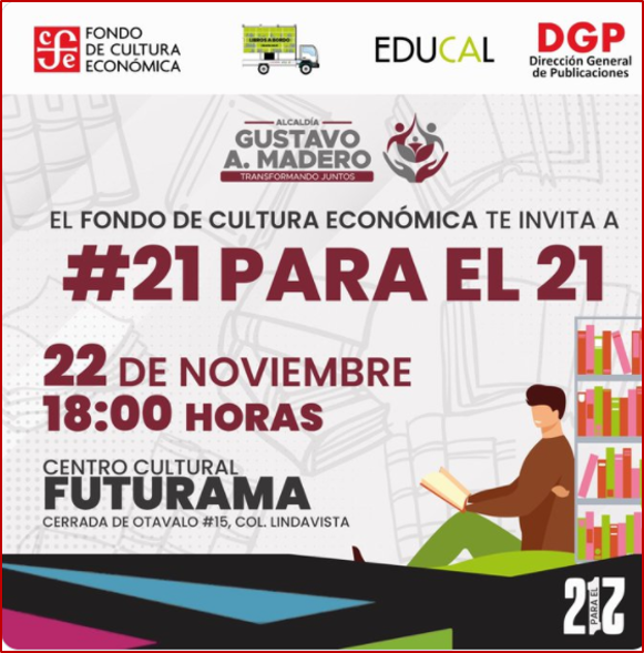 El Fondo de Cultura Económica y #TuAlcaldíaGAM te invitan a la presentación de la colección #21 para el 21, te esperamos este de noviembre a las 18:00 horas, en el Centro Cultural Futurama.